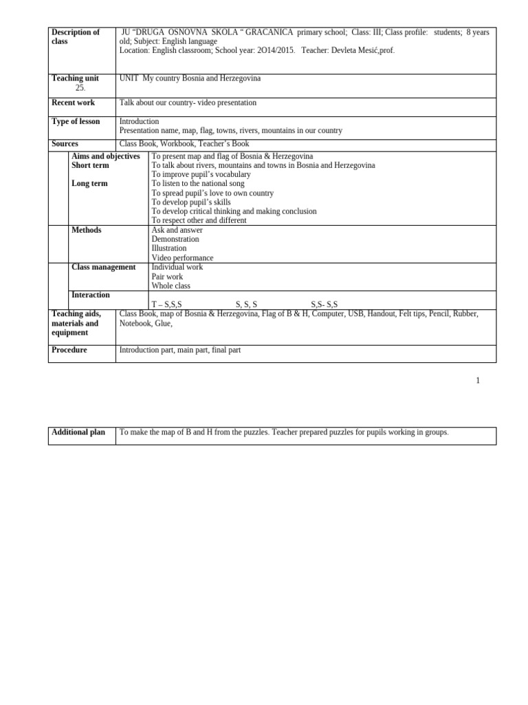 Teaching aids, Class Book, map of Bosnia & Herzegovina, Flag of B & H, Computer, USB, Handout, Felt tips, Pencil, Rubber,