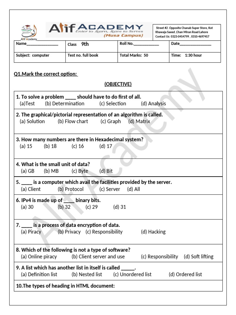 Subject: computer Test no. full book Total Marks: 50 Time: 1:30 hour