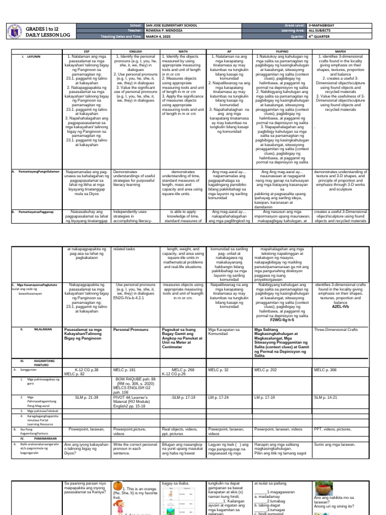 ng Panginoon sa EN2G-IVa-b-4.2.1 in m or cm. katumbas na tungkulin at kasalungat, sitwasyong textures, proportion and