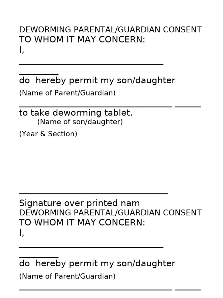 I, ________________________________________, do hereby permit my son/daughter ____________________________________to take deworming
