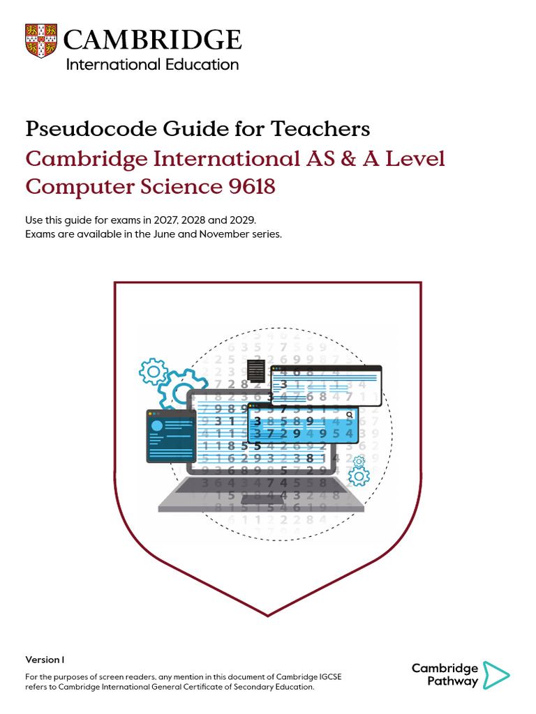 Cambridge International AS & A Level Computer Science 9618 Pseudocode Guide for Teachers for 2027, 2028 and 2029.
