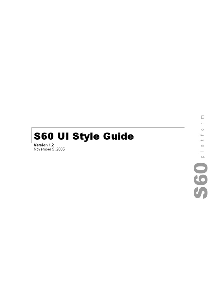 This document gives an overview of the S60 user interface and describes its essential parts, giving examples of how to use the interface elements. The document can be used as an introduction to the style or as reference material. It can provide background material to help user interface designers make decisions about their products. The style guide should give an overview and provide enough guidelines for designing good applications, but not all the information to write the software. This is intended to be a compact and easy-to-read guide, which means leaving out many details that can be found in other documents. There is no general discussion about good usability; instead this document tries to clarify how the style elements of the S60 user interface are meant to be used in practice. The content is also intended to be independent of product-specific hardware, so that the guidelines would apply to any product that implements the user interface style. Sometimes this means leaving out information that would be appropriate for one product but maybe not for another one. This document is based on and replaces the Forum Nokia (http://www.forum.nokia.com/) document Developers Guide to Series 60 UI Category.