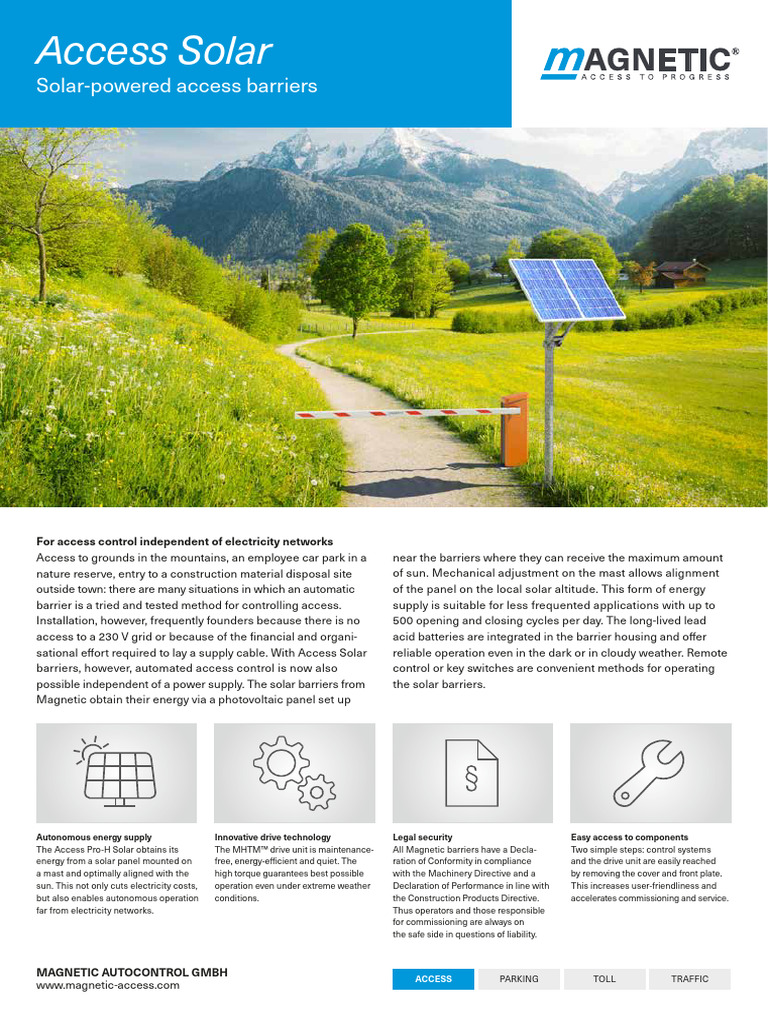 The Access Pro-H Solar obtains its The MHTM™ drive unit is maintenance- All Magnetic barriers have a Decla Two simple steps: control systems