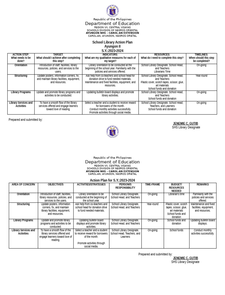 Structuring Update posters, information corners, fix, Ask help from co-teachers and school head for School Library Designate, School Head, Year-round