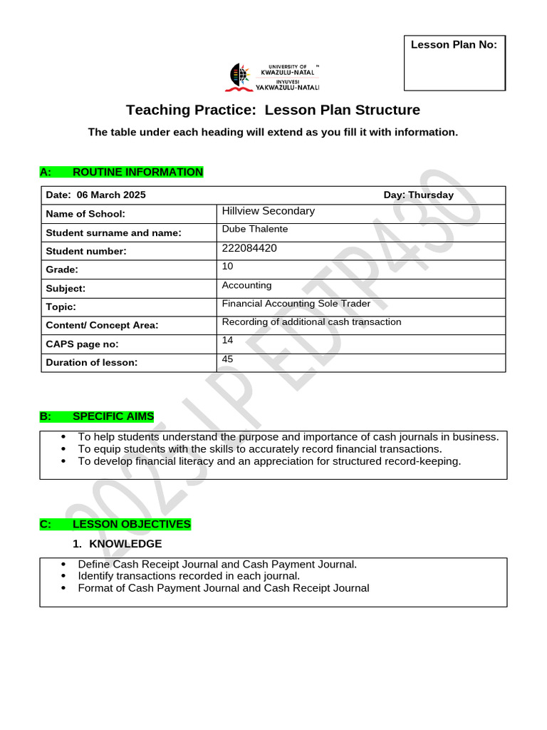 H: REFLECTION ON PLANNING AND TEACHING OF LESSON