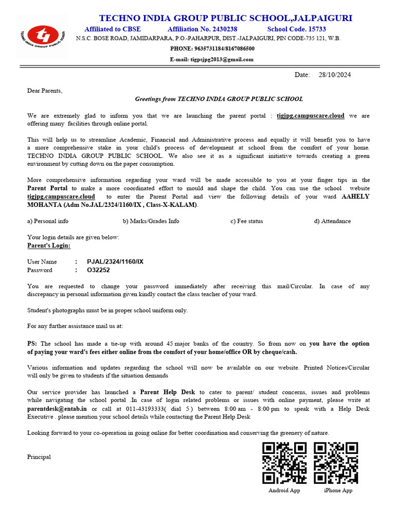 We are extremely glad to inform you that we are launching the parent portal : tigjpg.campuscare.cloud we are