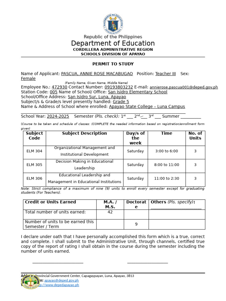 Employee No.: 472930 Contact Number: 09193803232 E-mail: annierose.pascua001@deped.gov.ph