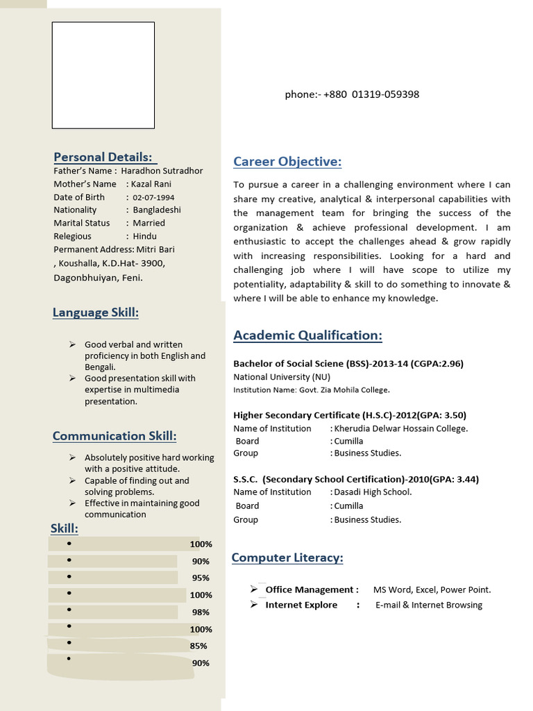 Mother’s Name : Kazal Rani To pursue a career in a challenging environment where I can