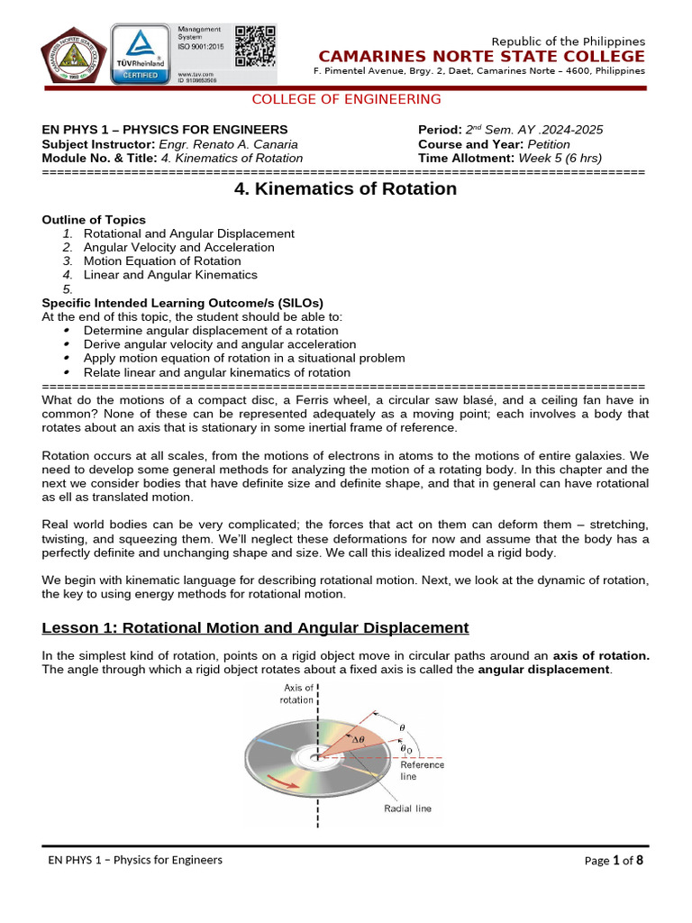 Module No. & Title: 4. Kinematics of Rotation Time Allotment: Week 5 (6 hrs)