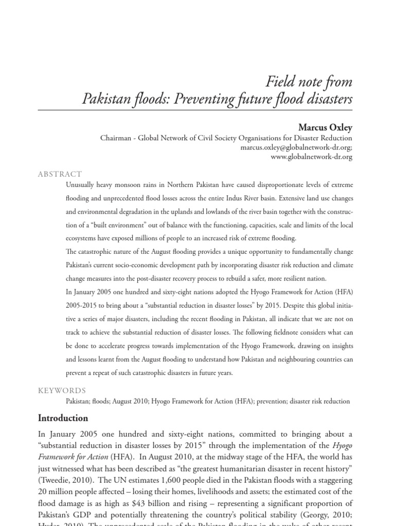 In January 2005 one hundred and sixty-eight nations, committed to bringing about a substantial reduction in disaster losses by 2015 through the implementation of the Hyogo Framework for Action (HFA). In August 2010, at the midway stage of the HFA, the world has just witnessed what has been described as the greatest humanitarian disaster in recent history (Tweedie, 2010). The UN estimates 1,600 people died in the Pakistan floods with a staggering 20 million people affected losing their homes, livelihoods and assets; the estimated cost of the flood damage is as high as $43 billion and rising representing a significant proportion of Pakistans GDP and potentially threatening the countrys political stability (Georgy, 2010; Hyder, 2010). The unprecedented scale of the Pakistan flooding in the wake of other recent