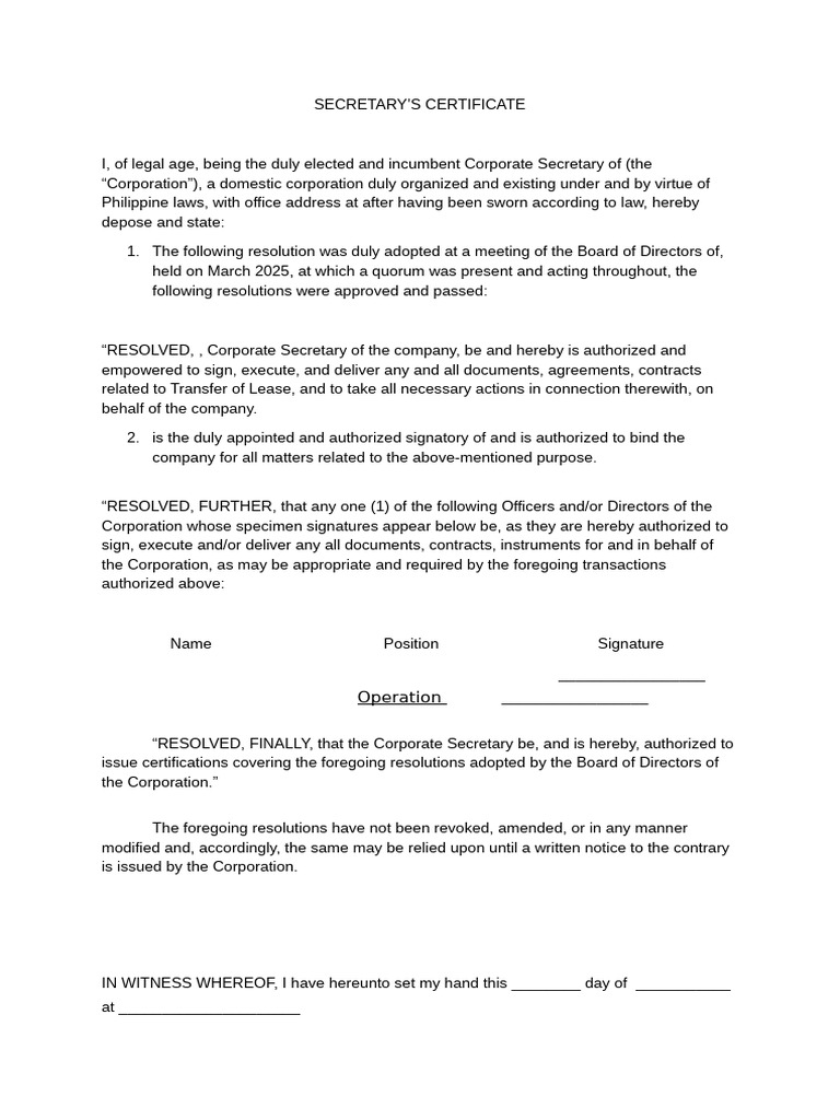 I, of legal age, being the duly elected and incumbent Corporate Secretary of (the