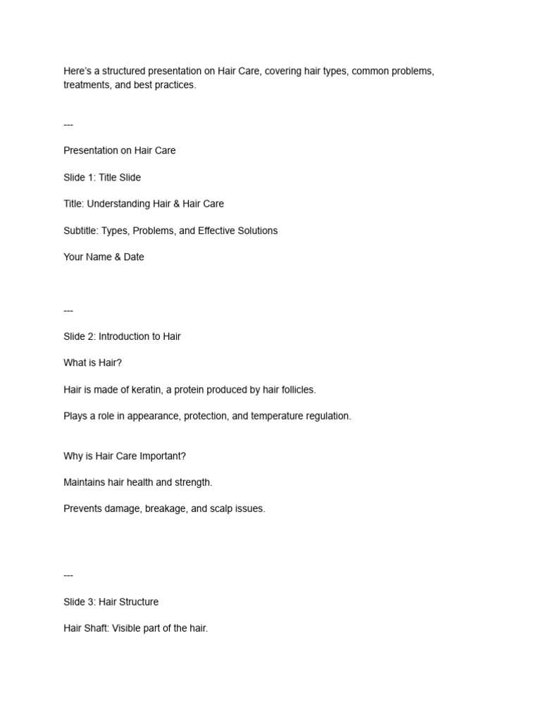 Here’s a structured presentation on Hair Care, covering hair types, common problems,