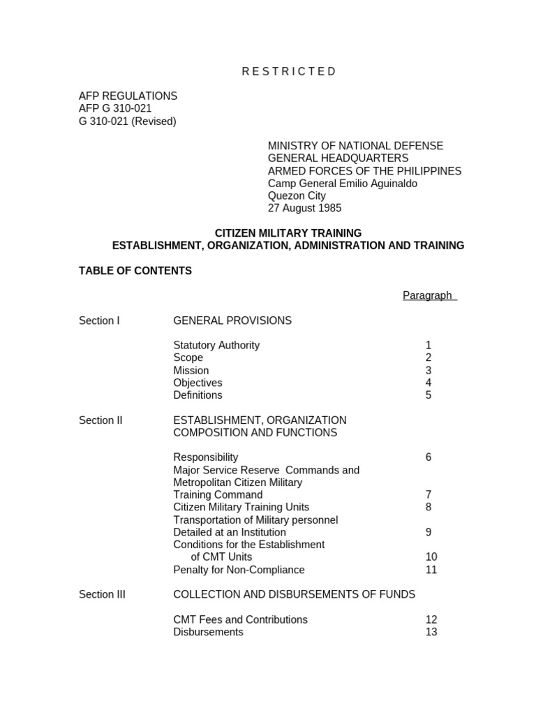 ESTABLISHMENT, ORGANIZATION, ADMINISTRATION AND TRAINING