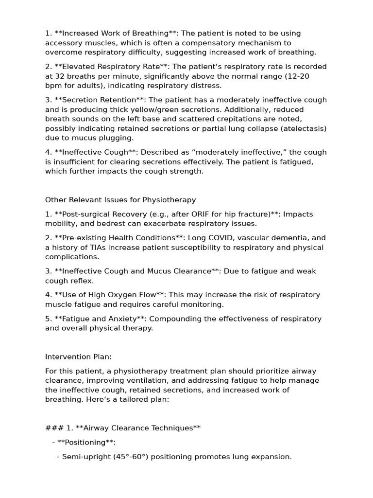 For this patient, a physiotherapy treatment plan should prioritize airway