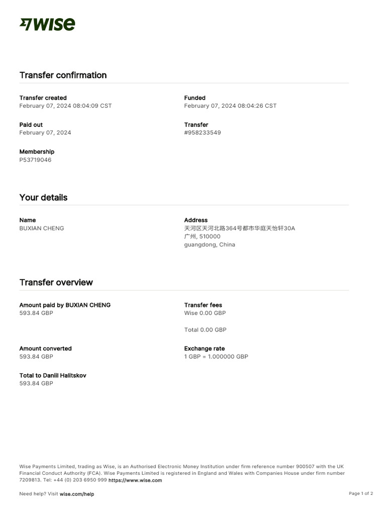 Wise Payments Ltd. on behalf of BUXIAN CHENG Local bank transfer