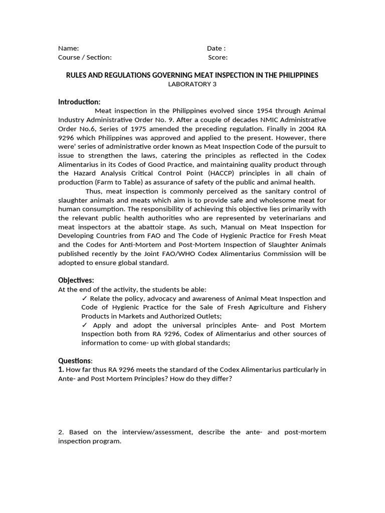 Inspection both from RA 9296, Codex of Alimentarius and other sources of