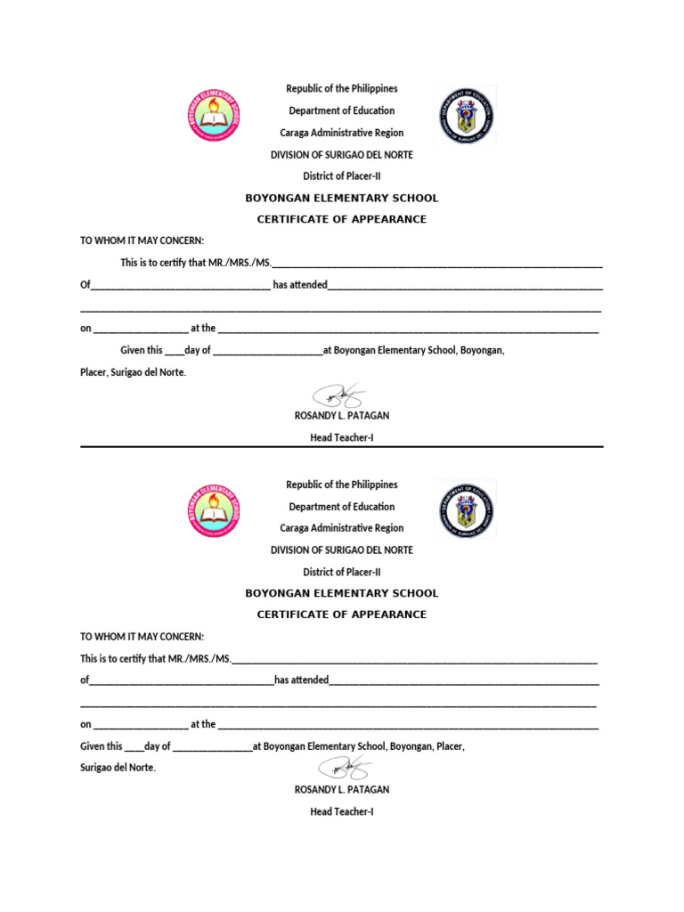 Given this ____day of ________________at Boyongan Elementary School, Boyongan, Placer,