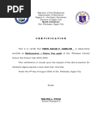 This is to certify that VICTORIOUS REY R. PATAGAN, is a bonafide Grade-I pupil of Boyongan Elementary