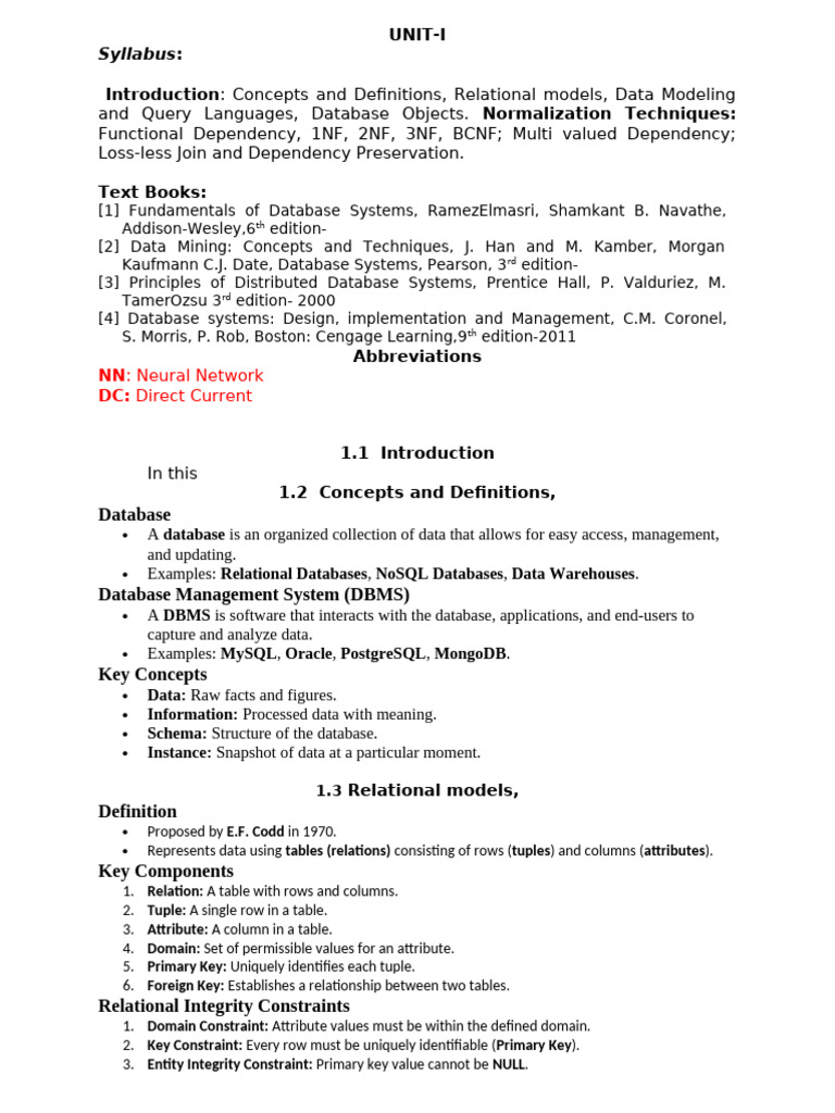 and Query Languages, Database Objects. Normalization Techniques: