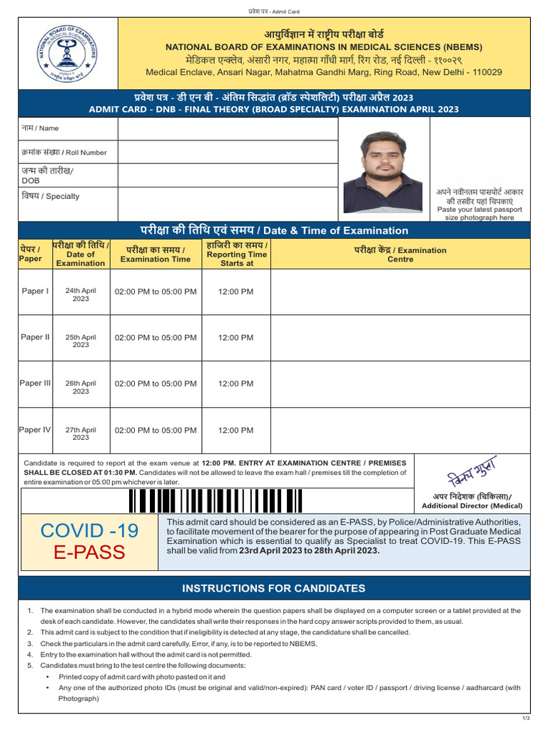 ADMIT CARD - DNB - FINAL THEORY (BROAD SPECIALTY) EXAMINATION APRIL 2023
