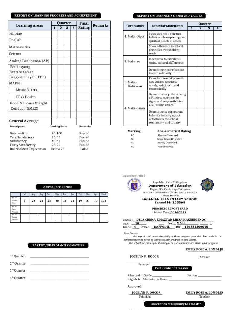 REPORT ON LEARNING PROGRESS AND ACHIEVEMENT REPORT ON LEARNER’S OBSERVED VALUES