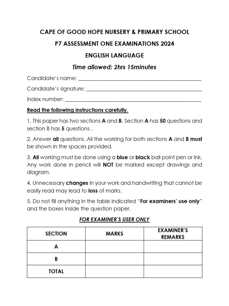 P7 ASSESSMENT ONE EXAMINATIONS 2024