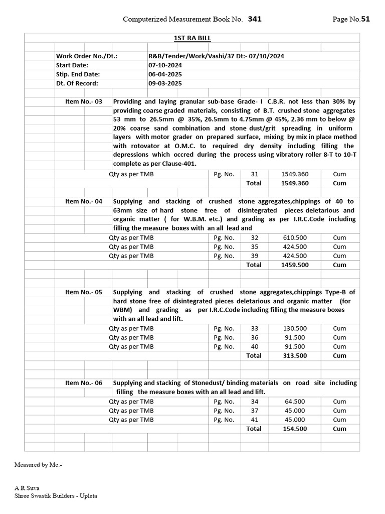 Work Order No./Dt.: R&B/Tender/Work/Vashi/37 Dt:- 07/10/2024