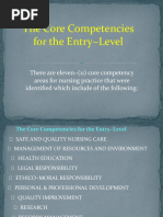 I. SAFE AND QUALITY NURSING CARE CORE COMPETENCY 1: Demonstrate knowledge based on health/illness status of individual/ groups Indicators : Identifies health needs of patients/groups Explains patient/group status CORE COMPETENCY 2: Provides sound decision making in care of individual/groups considering their beliefs, values Indicators : Problem identification Data gathering related to problem Data analysis Selection appropriate action Monitor progress of action taken CORE COMPETENCY 3: Promotes patient safety and comfort Indicators : Performs age-specific safety measures and comfort measure in all aspects of patient care CORE COMPETENCY 4: Priority setting in nursing care based on patients needs Indicators : Identifies priority needs of patients Analysis of patients needs Determine appropriate nursing care to be provided CORE COMPETENCY 5: Ensures continuity of care