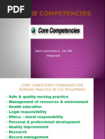 CORE COMPETENCY STANDARDS FOR NURSING PRACTICE IN THE PHILIPPINES (Click here to show the content of each core competency standards) Safe & quality nursing practice Management of resources & environment Health education Legal responsibility Ethico moral responsibility Personal & professional development Quality improvement Research Record management Communication Collaboration & teamwork LEGAL BASES Article 3 Sec.9 (c) of R.A. 9173/ Philippine Nursing Act 2002 Board shall monitor & enforce quality standards of nursing practice necessary to ensure the maintenance of efficient, ethical and technical, moral and professional standards in the practice of nursing taking into account the health needs of the nation. SIGNIFICANCE OF CORE COMPETENCY STANDARDS Unifying framework for nursing practice, education, regulation Guide in nursing curriculum development Framework in developing test syllabus for nursing profession entrants Tool for nurses performance evaluation Basis for advanced nursing practice, specialization Framework for developing nursing training curriculum Public protection from incompetent practitioners Yardstick for unethical, unprofessional nursing practice Phases of developing competency standards 1st Phase Competency identification through DACUM 2nd Phase Verification of identified competencies