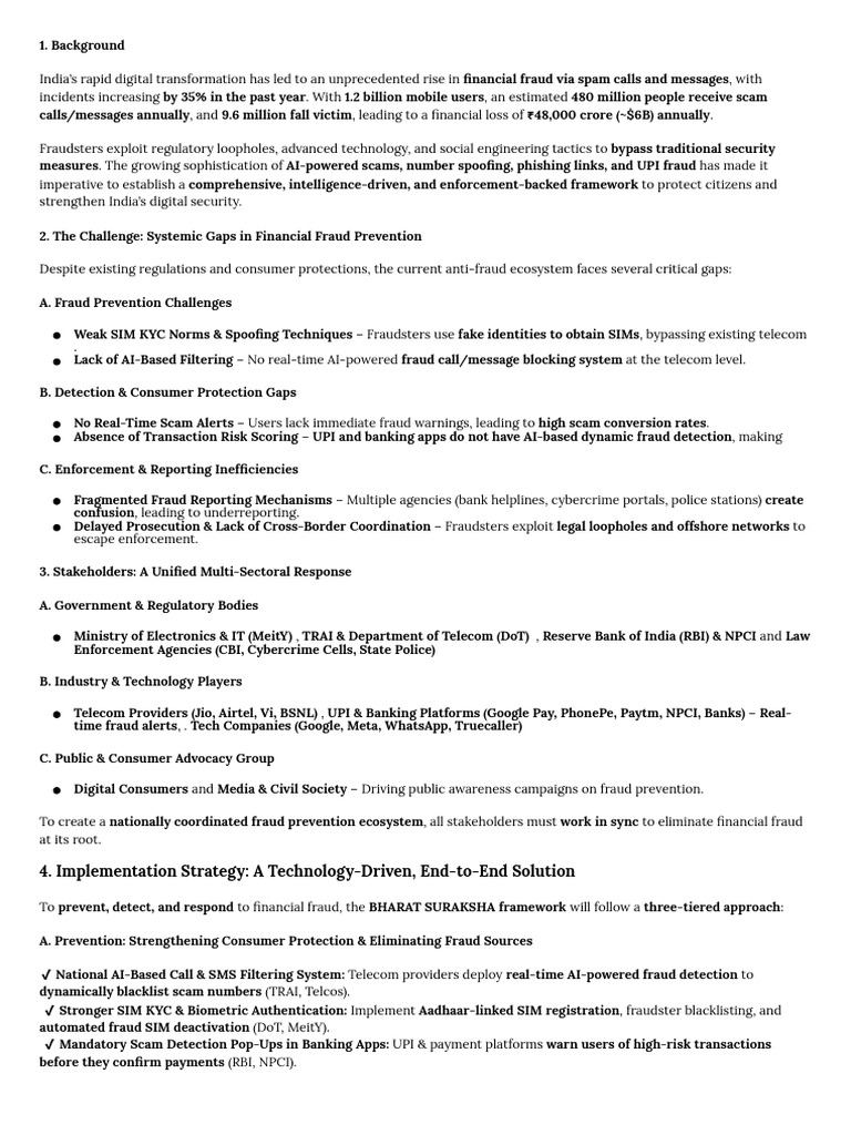 To prevent, detect, and respond to financial fraud, the BHARAT SURAKSHA framework will follow a three-tiered approach: