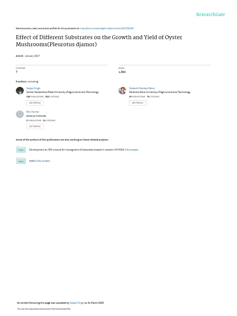 Citation: Singh Satpal, et al., (2017) Effect of Different Substrates on the Growth and Yield of Oyster Mushrooms(Pleurotus djamor). International Journal of Agriculture