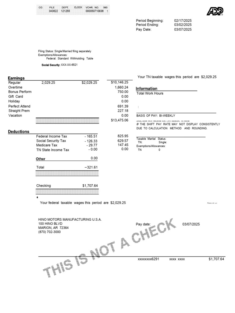 Gross Pay $2,029.25 $13,475.06 LEGAL ADDR 5515 MELROSE AVE, L O S ANGELES, CA 90038