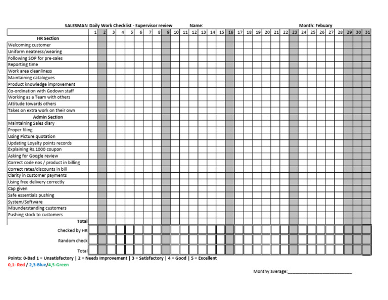 SALESMAN Daily Work Checklist - Supervisor review Name: Month: Febuary