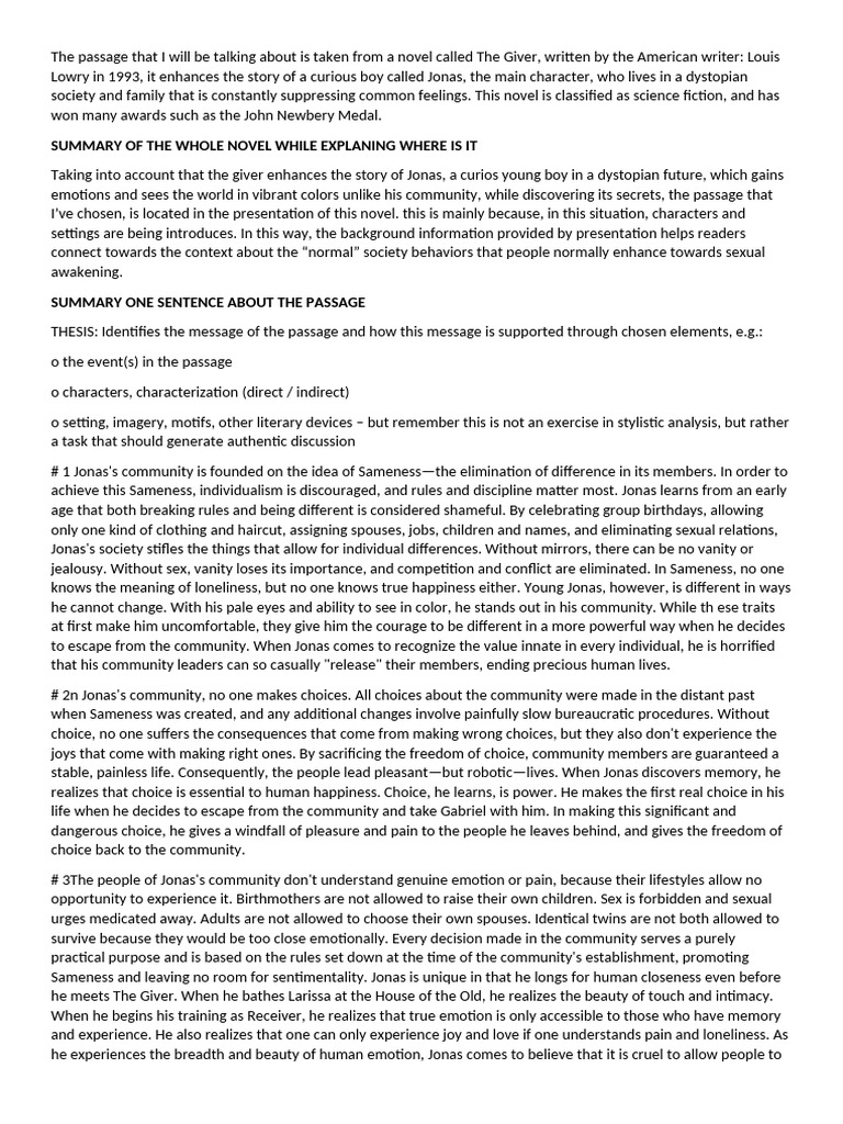 The passage that I will be talking about is taken from a novel called The Giver, written by the American