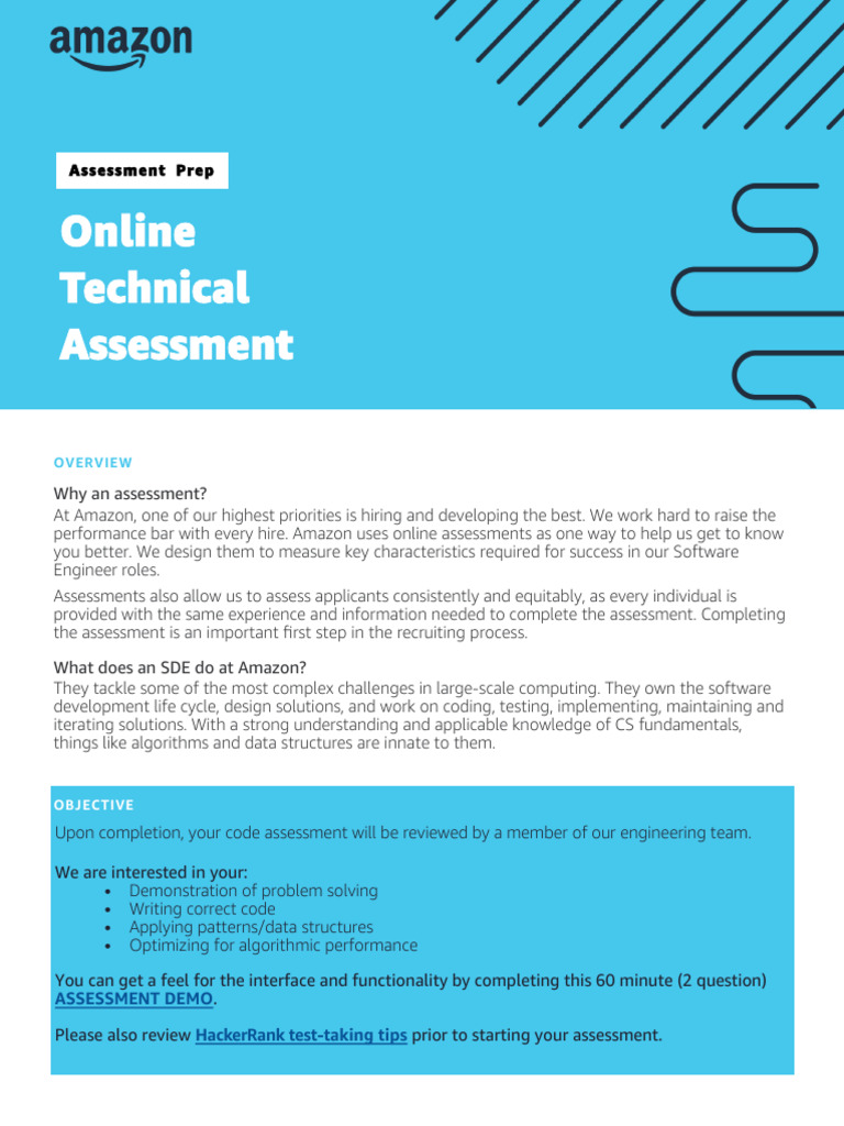 performance bar with every hire. Amazon uses online assessments as one way to help us get to know
