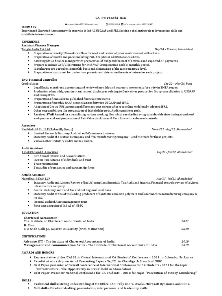 Experienced Chartered Accountant with expertise in Ind AS, USGAAP and IFRS. Seeking a challenging role to leverage my skills and