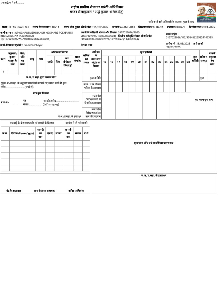 राज्य:UTTAR PRADESH मस्टर रोल संख्या : 10711 मस्टर रोल मुद्रण की दिनांक : 15/03/2025 जनपद:AZAMGARH विकास खंड:PALHANA पंचायत:OGHANI वित्तीय साल:2024-2025