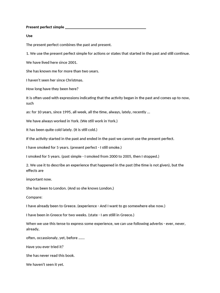 1. We use the present perfect simple for actions or states that started in the past and still continue.