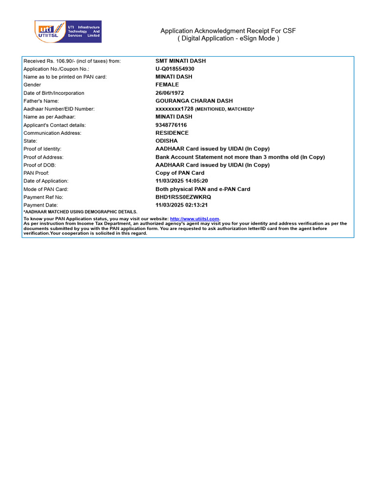 Name as per Aadhaar: MINATI DASH