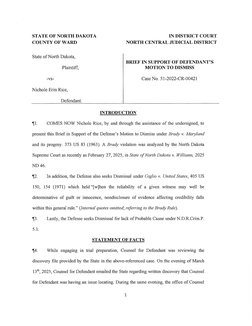 Statement of Facts: Details the factual background and evidence supporting the motion to dismiss, including the discovery of evidence. Introduction: Provides the introductory context and overview for the defendant's motion to dismiss. Violation of Rights: Discusses the alleged violation of the defendant's rights by failing to disclose evidence. Evidence Issues: Addresses issues with the evidence presented and the implications for probable cause. Conclusion: Summarizes the motion to dismiss all counts based on the analysis presented in previous sections. STATE OF NORTH DAKOTA, IN DISTRICT COURT