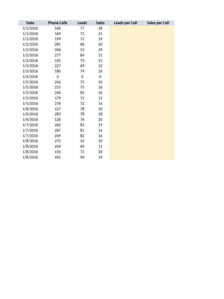1) Populate column E to calculate Leads per Call (column C divided by column B), and double click the lower-right