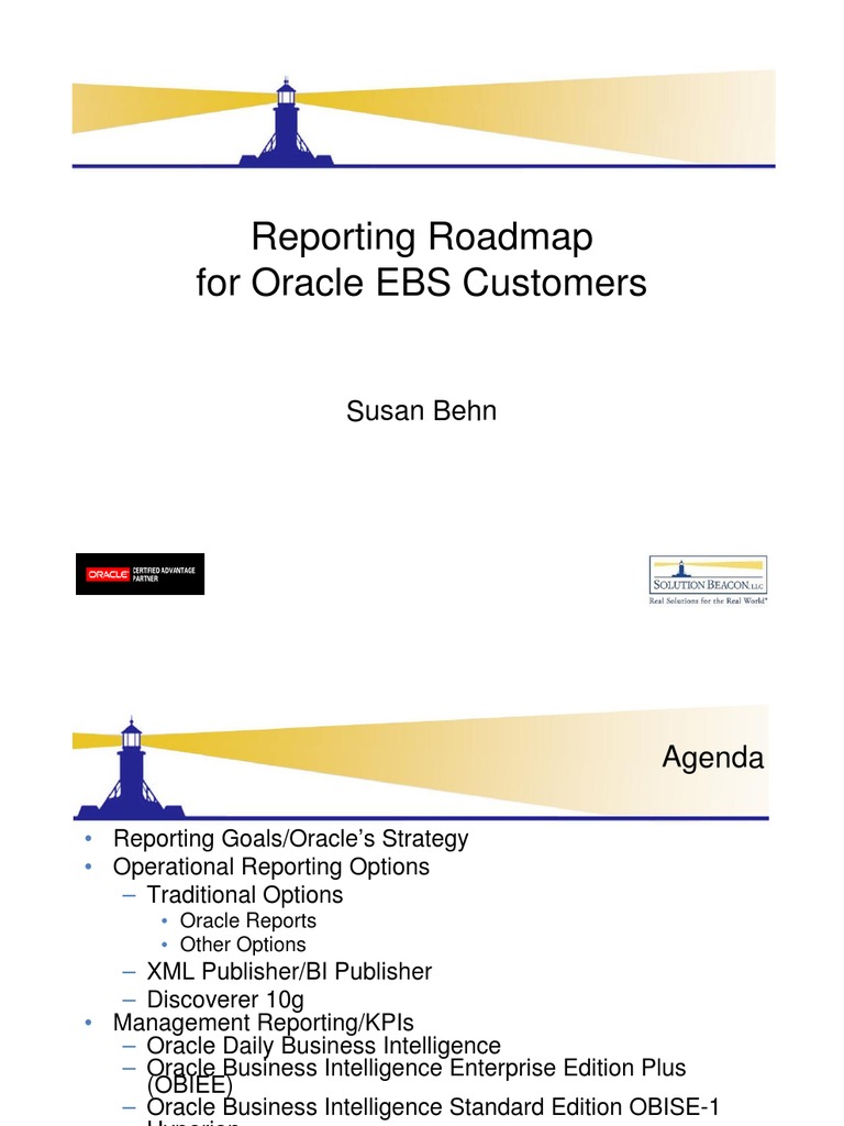 Oracle Reports R12 uses 10g version Technically, reports should upgrade easily from 6i by recompiling code Table changes will require modifications Ideal for static operational/transactional reports Very Robust Provides source data for XML/BI