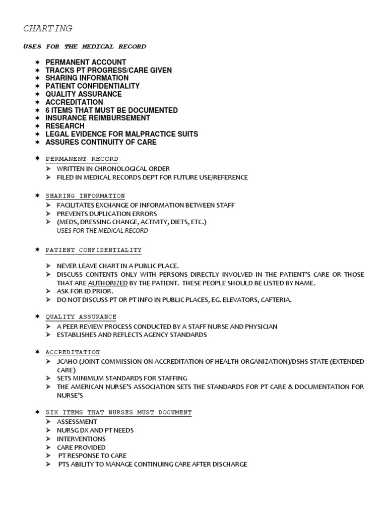 WRITTEN IN CHRONOLOGICAL ORDER FILED IN MEDICAL RECORDS DEPT FOR FUTURE USE/REFERENCE SHARING INFORMATION FACILITATES EXCHANGE OF INFORMATION BETWEEN STAFF PREVENTS DUPLICATION ERRORS (MEDS, DRESSING CHANGE, ACTIVITY, DIETS, ETC.) USES FOR THE MEDICAL RECORD PATIENT CONFIDENTIALITY NEVER LEAVE CHART IN A PUBLIC PLACE. DISCUSS CONTENTS ONLY WITH PERSONS DIRECTLY INVOLVED IN THE PATIENTS CARE OR THOSE THAT ARE AUTHORIZED BY THE PATIENT. THESE PEOPLE SHOULD BE LISTED BY NAME. ASK FOR ID PRIOR. DO NOT DISCUSS PT OR PT INFO IN PUBLIC PLACES, EG. ELEVATORS, CAFTERIA. QUALITY ASSURANCE A PEER REVIEW PROCESS CONDUCTED BY A STAFF NURSE AND PHYSICIAN ESTABLISHES AND REFLECTS AGENCY STANDARDS ACCREDITATION JCAHO (JOINT COMMISSION ON ACCREDITATION OF HEALTH ORGANIZATION)/DSHS STATE (EXTENDED CARE) SETS MINIMUM STANDARDS FOR STAFFING THE AMERICAN NURSES ASSOCIATION SETS THE STANDARDS FOR PT CARE & DOCUMENTATION FOR NURSES SIX ITEMS THAT NURSES MUST DOCUMENT ASSESSMENT NURSG DX AND PT NEEDS INTERVENTIONS CARE PROVIDED PT RESPONSE TO CARE PTS ABILITY TO MANAGE CONTINUING CARE AFTER DISCHARGE