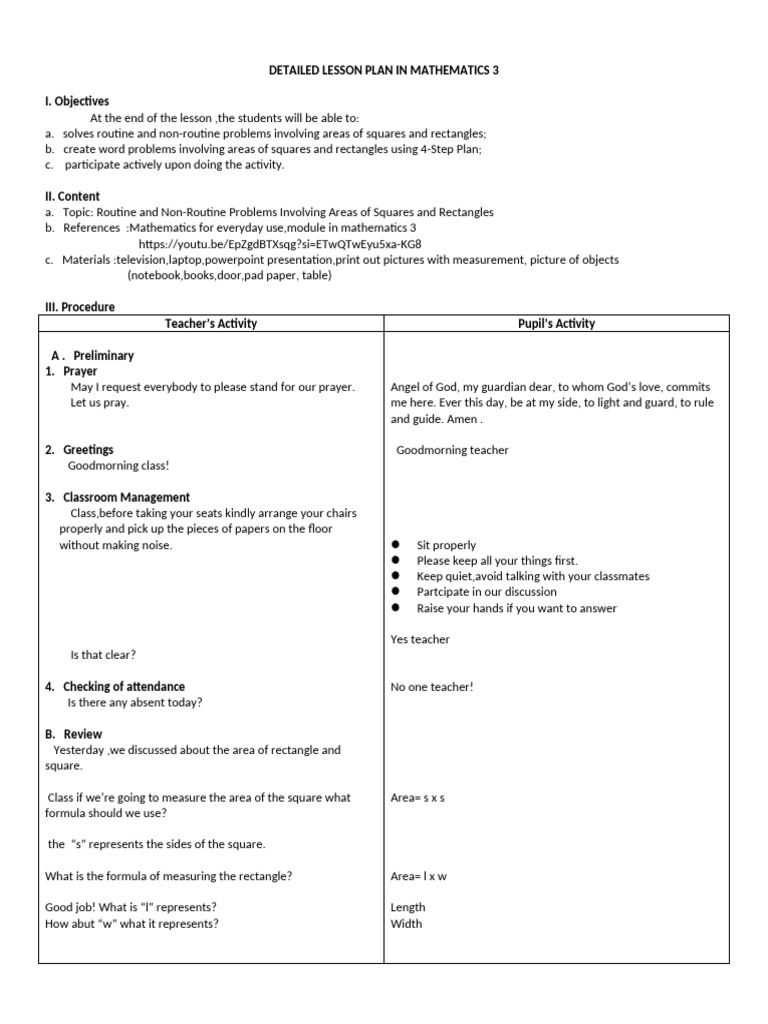 a. Topic: Routine and Non-Routine Problems Involving Areas of Squares and Rectangles