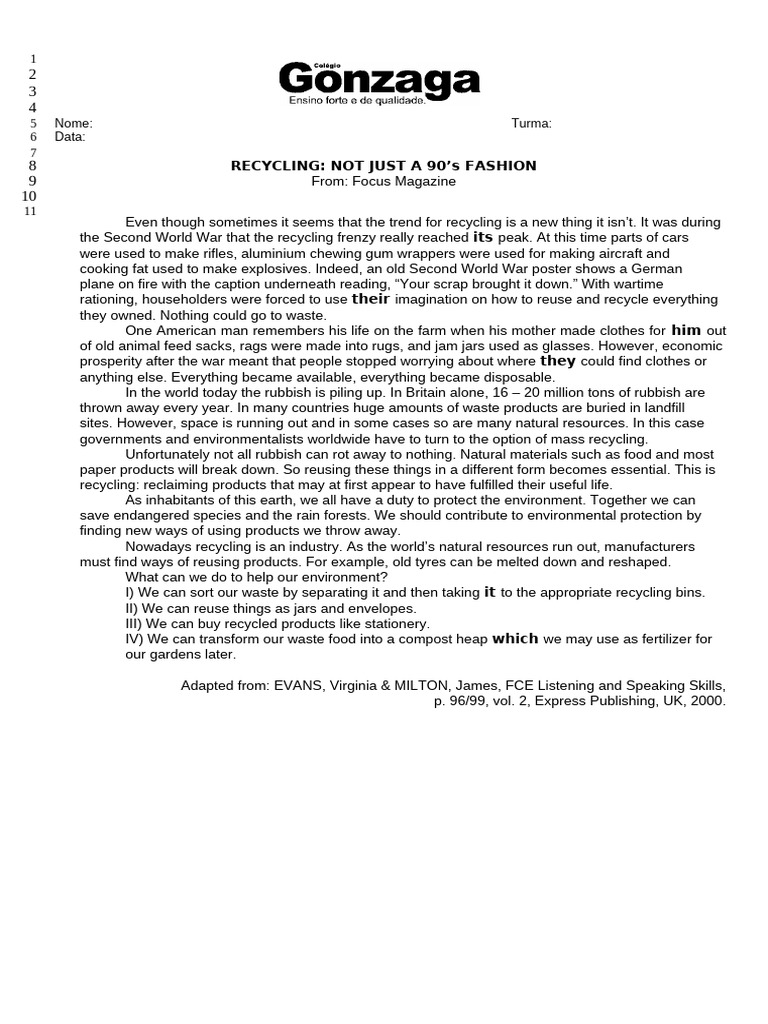 1) The main purpose of the text “Recycling: Not Just a 90’s Fashion” is