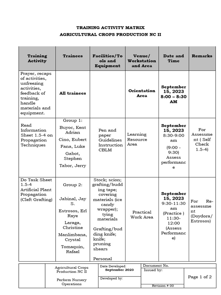 Training Trainees Facilities/To Venue/ Date and Remarks