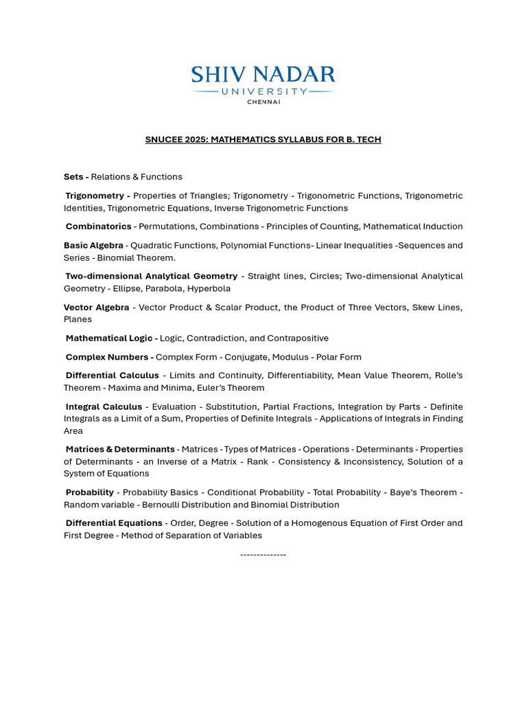 SNUCEE 2025: MATHEMATICS SYLLABUS FOR B.