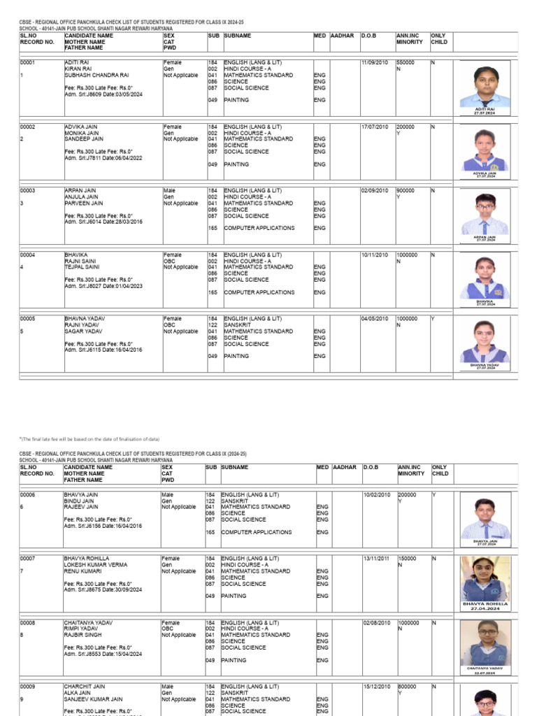 CBSE - REGIONAL OFFICE PANCHKULA CHECK LIST OF STUDENTS REGISTERED FOR CLASS IX (2024-25)