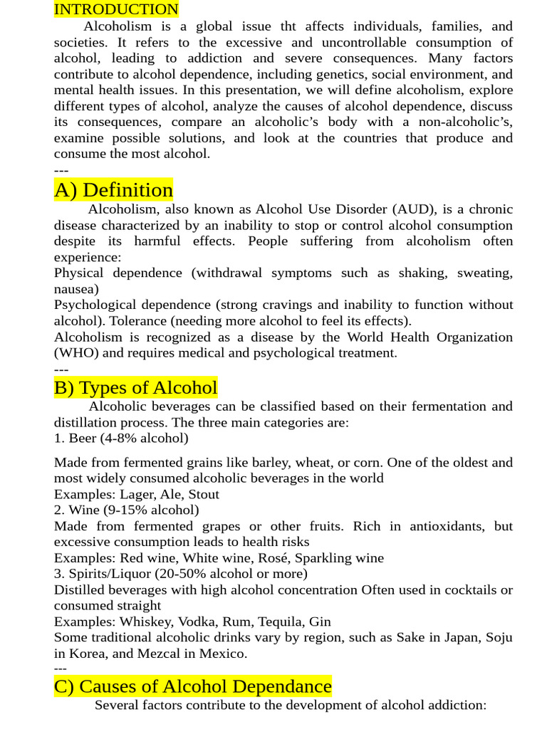 different types of alcohol, analyze the causes of alcohol dependence, discuss