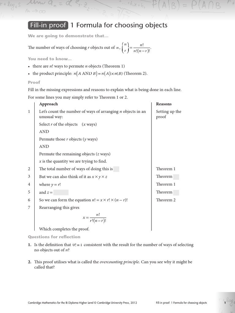 Cambridge Mathematics for the IB Diploma Higher Level © Cambridge University Press, 2012 Fill-in proof: 1 Formula for choosing objects 1